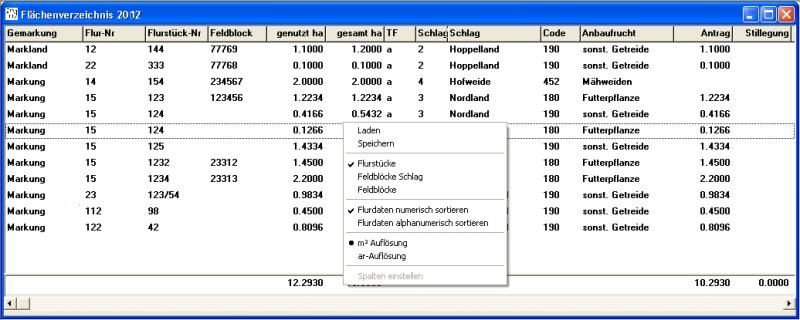 Dabei läßt sich einstellen, ob die Anzeige nach Schlägen, Feldblöcken oder aber Flurstücken erfolgen soll. Selbstverständlich kann auch hier nach verschiedenen Kriterien sortiert werden, indem man die betreffenden Spalte im Tabellenkopf anklicket. Dabei läst sich auch einstellen, ob Flurbezeichnungen als Zahlen (1,2,3,19,29) oder aber als Text (1,19,2,29,3) betrachtet werden sollen: